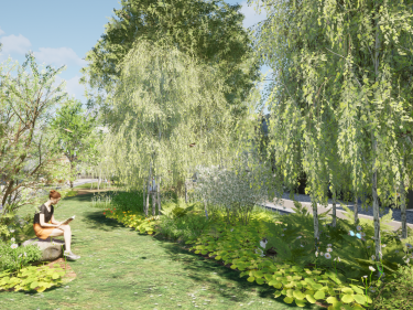 Het beplantingsplan werkt met drie soorten gebieden: maaipaden, bloemenweiden en bosranden. We kiezen voor Europese, inheemse planten die goed zijn voor de natuur. Deze soorten zorgen voor meer biodiversiteit en zien er in elk seizoen mooi uit. De bomen worden zorgvuldig gekozen en geplant, omdat er door de ondergrondse parkeergarage maar beperkte ruimte is om te groeien.