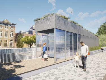 Het dak en de trap worden groener gemaakt met planten. Voor de huidige trap komt een bijzonder zitmeubel in de vorm van oude sluisdeuren. Dit idee komt uit de klankbordgroep. Het verwijst naar de sluizen die vroeger op deze plek zaten en waarvan de deuren nu bij Nijestee hangen. Het uitkijkpunt verdwijnt, en de gevel krijgt een nieuwe, deels open uitstraling. Langs de ingang komt extra zitruimte. Dit zorgt ervoor dat het gebouw beter past bij de groene inrichting van het plein.