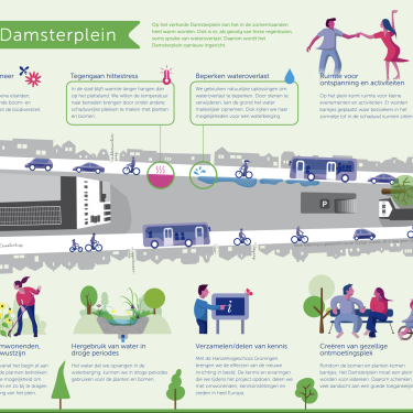 De gemeente Groningen krijgt € 1 miljoen euro van de Europese Commissie voor het uitwerken van een vergroeningsplan voor het Damsterplein. In 2020 is hiervoor een aanvraag ingediend bij het Europese LIFE-fonds. Met het LIFE-programma wil de Europese Commissie projecten stimuleren die passen binnen het Europese beleid van natuur, klimaat en milieu. De aanvraag voor het Damsterplein is inmiddels definitief goedgekeurd. Dit is goed nieuws voor de stad, want dit betekent dat het plan kan worden uitgewerkt. Als de werkzaamheden klaar zijn, is het Damsterplein het ‘coolste’ plein van Groningen.