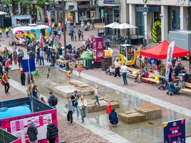 De vriendin krijgt gelijk. Om één uur is het al gezellig druk op het Jouw Grote Markt-festival om de opening van onze nieuw ingerichte huiskamer van de stad te vieren. Vooral het waterelement en de kidsarea zijn dan al erg in trek.