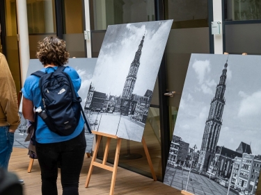 Aan de overkant van het waterelement en de kidsarea is het gebouw van ABN/AMRO open voor publiek. Een ballonnenboog siert de ingang. Grote en indrukwekkende foto’s van de Grote Markt hangen aan de muren van de benedenverdieping. Foto’s van voor, tijdens en na de oorlog. De broers Erwin en Robert zijn druk bezig met de kleurplatenwedstrijd voor kinderen die de bank organiseert. “Het is een idee van broer Erwin en collega Rosalie, de kleurplatenwedstrijd’, vertelt Robert. “Ze hebben contact gezocht met kunstenaar Erik Zwezerijnen, die ook een galerie heeft in de Folkingestraat, om een mooie kleurplaat te maken van de Grote Markt. Erik wilde dat graag doen. Kinderen kunnen hun kleurplaat bij ons inleveren en mooie prijzen winnen. De eerste prijs bijvoorbeeld is een bankrekening bij ons waar we dan direct 300 euro op storten. En daarnaast kunnen ze een gesigneerd shirt van FC Groningen winnen. Verder doneren we voor iedere kleurplaat die wordt ingeleverd, maar ook voor elke kopje koffie dat we schenken, één euro voor het Stichting Jeugd Educatie Fonds. En dat belooft nog wat, want vanaf twaalf uur vanmiddag is het al volle bak hier.”