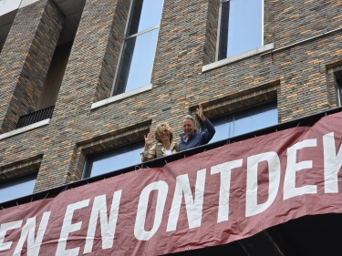 Iets verderop zwaaien Esther en Koos vanaf het balkon van Vindicat naar bekenden die beneden voorbijlopen. “We hebben vandaag 15 jaar verkering”, roept Esther enthousiast. “En het is ontzettend leuk om dat hier te vieren.” Vriend Koos is wat rustiger. Hij geniet van het uitzicht. “Magnifiek om het plein vanaf hier te bekijken. De intimiteit, prachtig. Vanaf een balkon verder naar boven, is het uitzicht zinsbegoochelend. Ga maar eens kijken. Je waant je onderdeel van het plein. Fantastisch.”