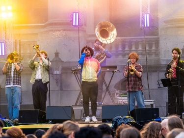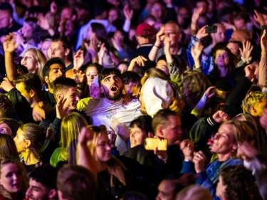 Als de avond langzaam over het plein valt, blazen de mannen van Broken Brass op het podium voor het stadhuis, met veel energie de avond muzikaal leven in. De Grote Markt komt al flink op stoom. In de Anda Kerkhovenzaal in het stadhuis merken de bezoekers van de silent disco niets van de energie op het plein. De rij om naar binnen te mogen is lang. “Maar het is fantastisch en het wachten waard”, zeggen Eva en Sietske die net naar buiten komen. “Je kunt kiezen uit drie kanalen, met alle drie andere muziek. Naast ons ging een groepje meiden helemaal uit hun dak. Wij deden het juiste wat rustiger aan. Grappig om te zien.”