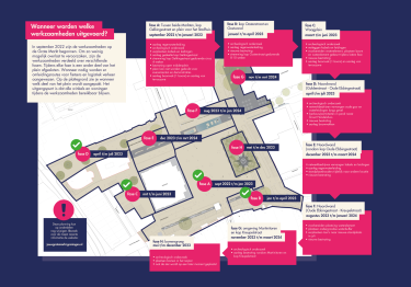 De werkzaamheden op het plein zijn op in september 2022 gestart. Om zo min mogelijk overlast te veroorzaken, zijn de werkzaamheden verdeeld over verschillende fasen. Tijdens elke fase is een ander deel van het plein afgesloten. Wanneer nodig, worden er omleidingsroutes voor fietsers en logistiek verkeer aangewezen. Alle winkels en woningen blijven gedurende de werkzaamheden wel gewoon bereikbaar. De verwachting is dat de werkzaamheden begin 2024 worden afgerond. Hier vind je een globaal overzicht van de fasering van de werkzaamheden. Deze planning kan op onderdelen nog wijzigen.
