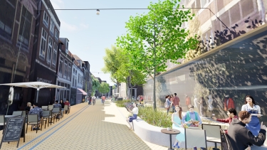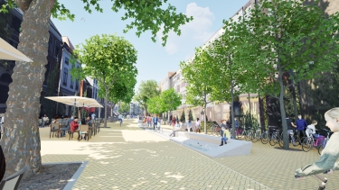 Er worden zeven bomen toegevoegd in de straten. Vakken met beplanting en zitmogelijkheden zorgen voor fijne verblijfsplekken.
